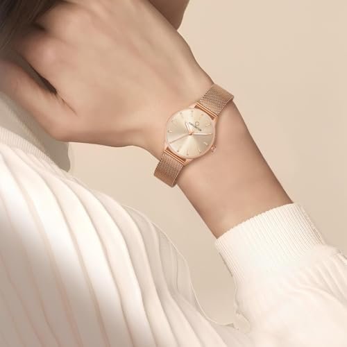 The watch combines classic analog display with a chic mesh strap, fusing timeless elegance with modern style. It's a versatile accessory suitable for various occasions. You'll appreciate its sophisticated appeal.