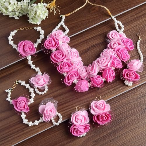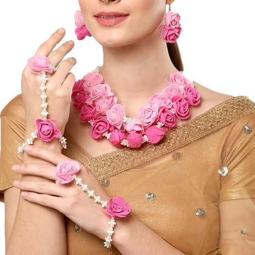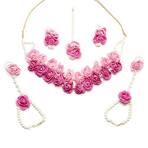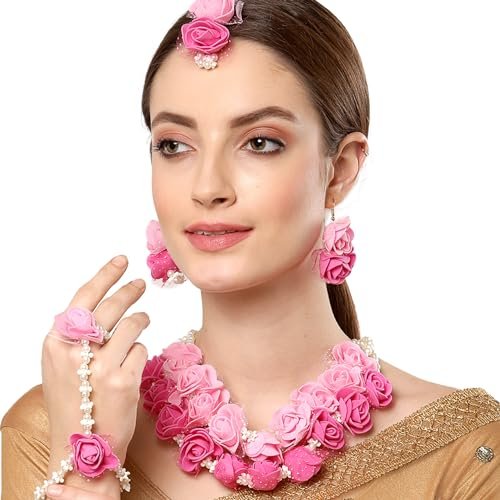 Elevate your bridal elegance with the ZENEME Pearl Pink & Red 5-Piece Bridal Jewellery Set, crafted for the radiance of Mehandi, Haldi, or Baby Shower celebrations. Each piece features delicate floral motifs accented with lustrous pearls, offering a refined and fashionable ensemble that complements both traditional and modern attire.