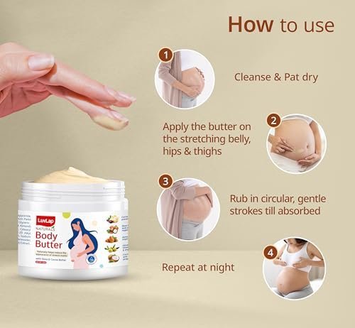 For best results, apply LuvLap Body Butter twice daily—morning and night—on clean, dry skin. Gently massage onto the belly, hips, thighs, and other areas prone to stretch marks. Regular use helps maintain skin elasticity and reduces discomfort caused by tight, itchy skin.